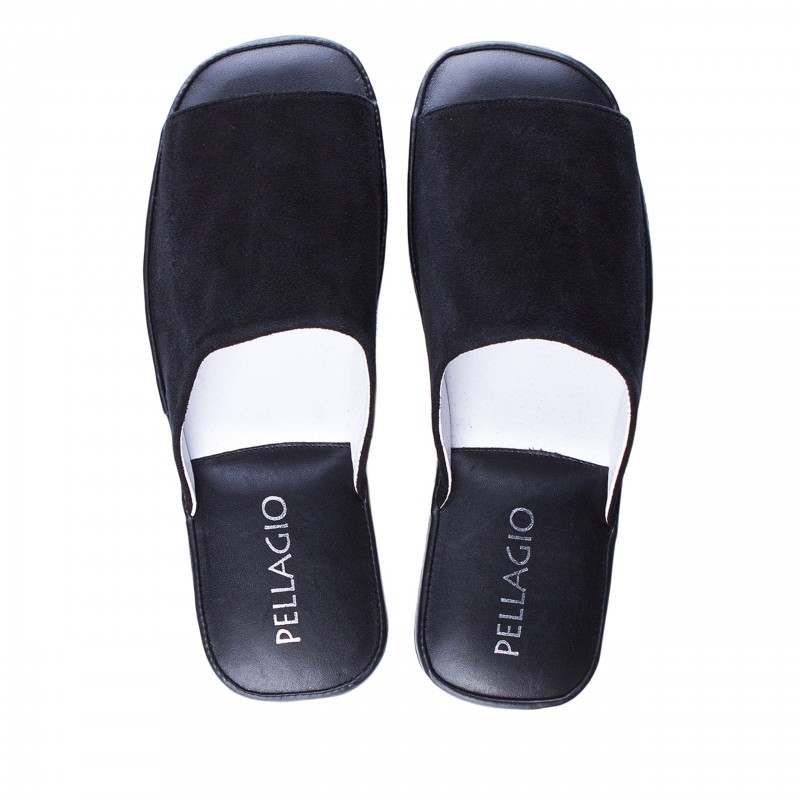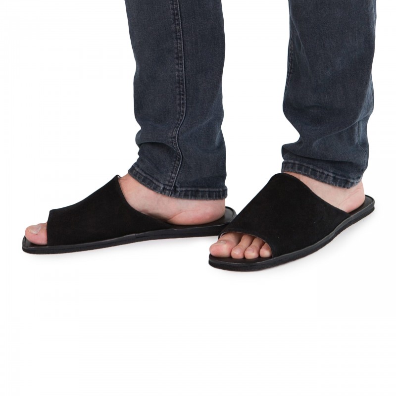 Классическая модель открытых мужских тапочек черного цвета выполнена в сочетании кожи с замшей со всем вниманием к комфорту. Легкая и бесшумная подошва из EVA позволит выйти в тапочках даже на открытую террасу.