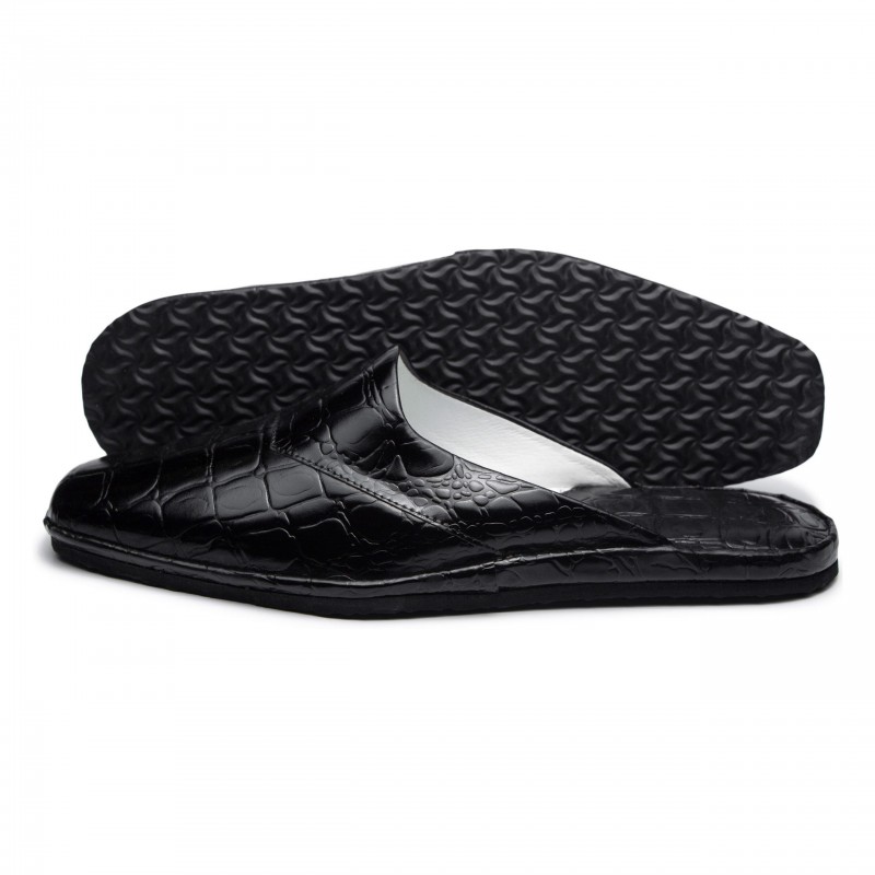 Закрытые мужские тапочки черного цвета. Удобные тапочки выполнены из прочной и эластичной кожи с имитацией кожи крокодила, легкая и бесшумная подошва из EVA делает их очень практичными. ВНИМАНИЕ! На узкую стопу можно брать на размер меньше. На широкую – размер в размер.