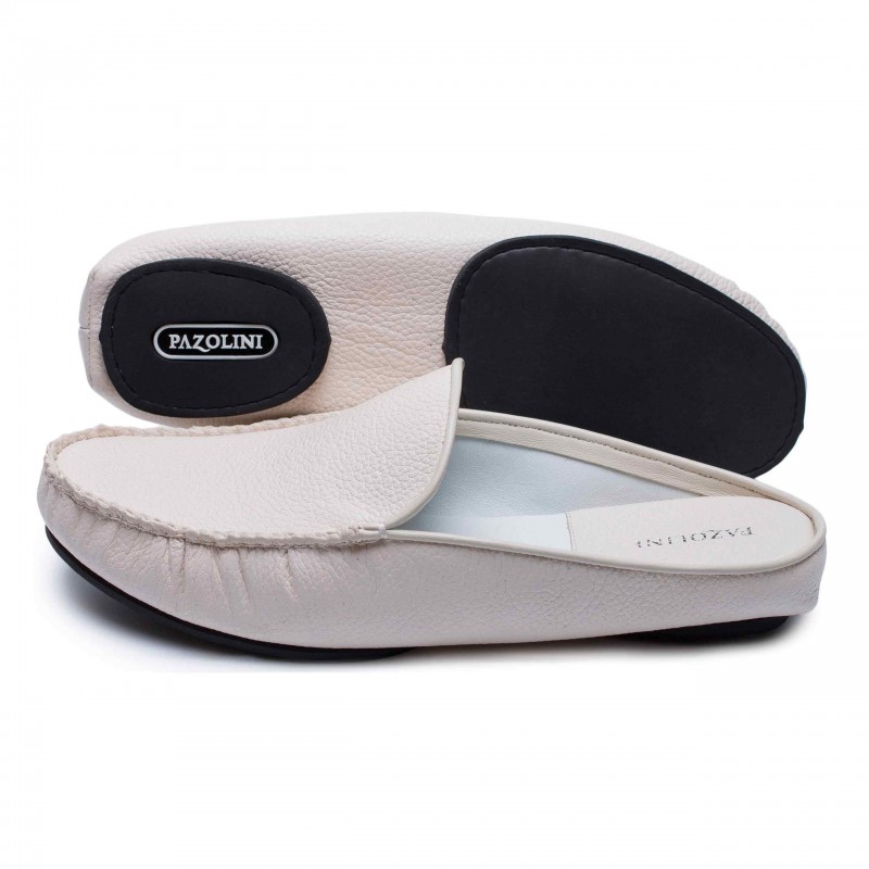 Стилизованные под мокасины домашние тапочки из прочной зернистой кожи бежевого цвета. Материал специально обработан, поэтому меньше пачкается. Подошва дополнена накладками из EVA, что придает практичности.