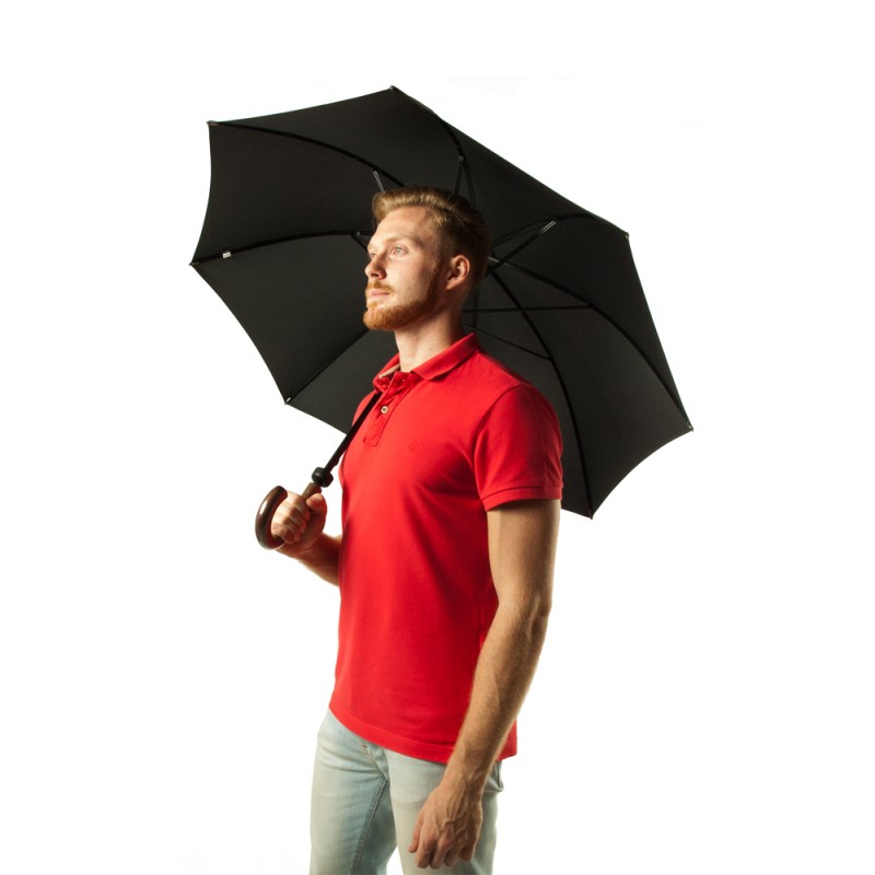 Респектабельная ручка натурального дерева очень удобна и практична, а в ее верхней части есть передвигающееся кольцо с помощью которого, закрыв зонт, можно скрепить спицы не закрывая при этом на хлястик. Но самое главное преимущество этого зонта состоит в том, что он имеет восемь спиц из усиленной стали и все они двойные, то есть там, где мы привыкли видеть одну спицу, здесь конструктивно их две – параллельно рядом.
